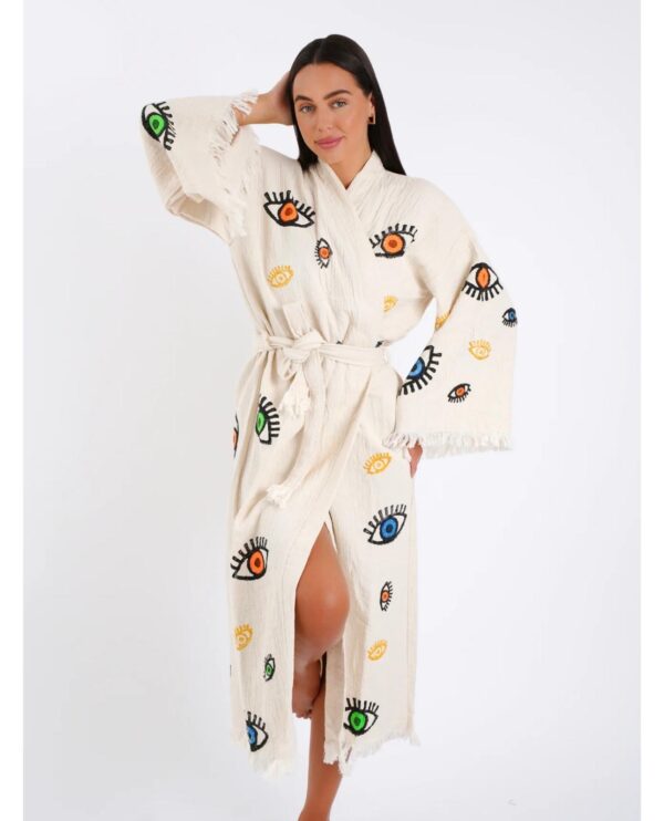 Халат от 100% органичен памук с ръчен печат и органични багрила Evil Eye Protection, бял с оранжева, зелена и синя шарка