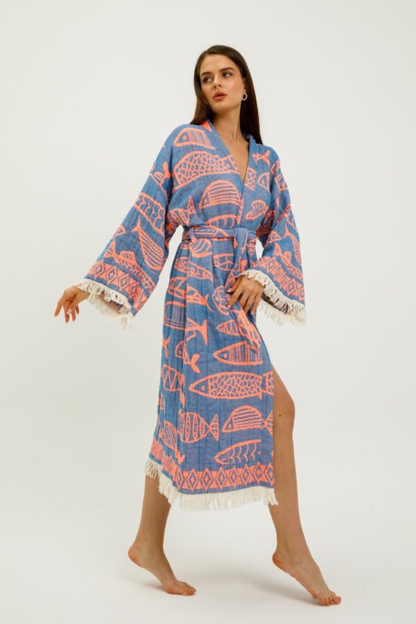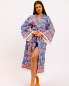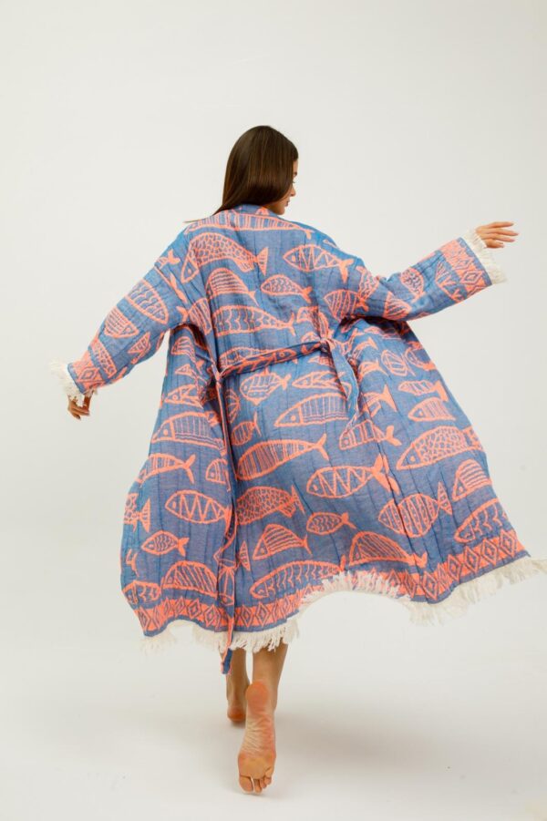 Всеки халат е изработен с техника за ръчен печат, използвайки органични багрила, което прави всяка бройка уникална. Натуралният памук позволява на кожата да диша, попива влагата бързо и създава усещане за мекота и лекота през целия ден.