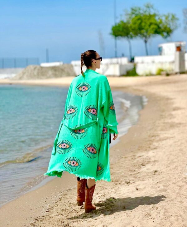 Халат от 100% органичен памук с ръчен печат и органични багрила Evil Eye Protection, тюркоазено зелено, миди дължинаХалат от 100% органичен памук с ръчен печат и органични багрила Evil Eye Protection, тюркоазено зелено, миди дължина