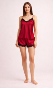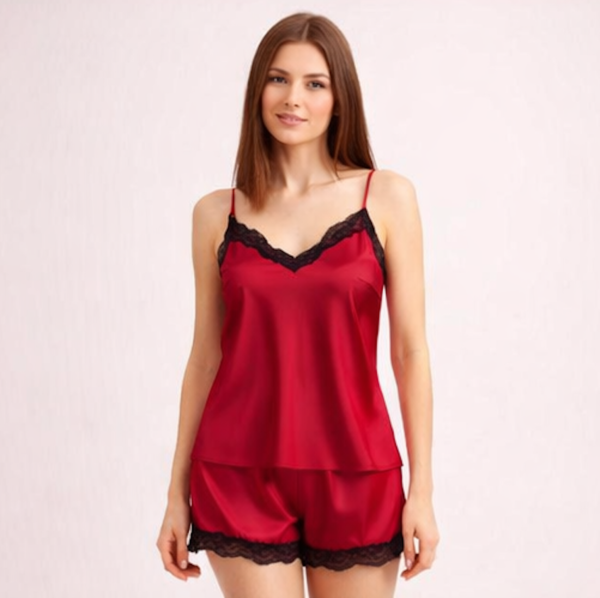 Открийте перфектния баланс между стил и комфорт с тази дамска сатенена пижама в цвят червено с черна дантела. Комплектът включва потник с тънки презрамки и къси панталонки с дантела, създадени да подчертаят женствеността и да осигурят максимално удобство.