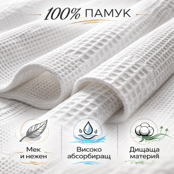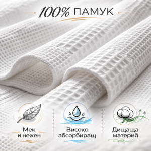Изработен от 100% висококачествен памук с плътност 260 г/м² – изключително мек на допир, с отлична абсорбираща способност за максимален комфорт след баня или СПА процедура.